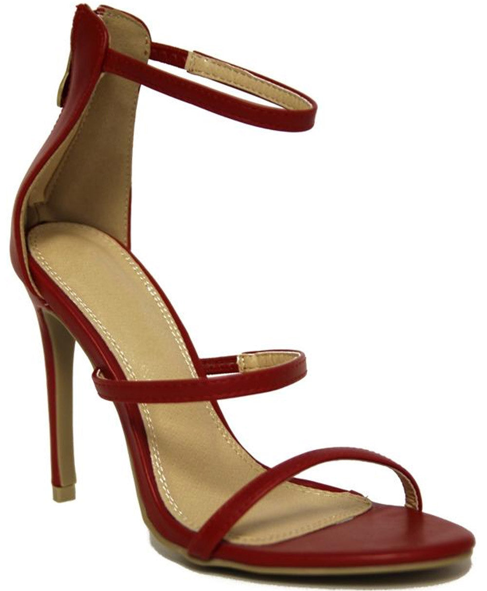 This strappy high heel has been crafted to show off your sultry, sexy legs! Three thin straps designed to display the polished toes of a true Brat! Go for stand out colors with this shoe.- Faux Leather